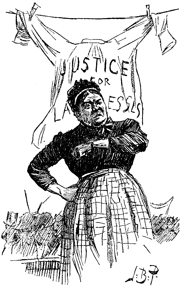 The Chairwoman (with patient good-humour). Now, I'm sure you'll all be as quiet as you can while I ... (Hubbub, caused by a personal altercation between two Women in the crowd, and shouts of "Order!") Because really my doctor has ordered me not to speak in the open air at all ... (Here an ill-conditioned female, taking offence for some inscrutable reason, remarks loudly, "'Er doctor, indeed, she's a beauty, she is—'er and 'er doctor!" More calls to order, and extreme indignation of the ill-conditioned female at being informed that she is "no lady," and had "better 'old 'er jaw"; ribald and utterly meaningless jests by the larrikins.) Order, please! (Imploringly.) I know you won't make it harder for me than you can help. (A young Lady in a very tall hat and feather is heard demanding that the Gentleman in front of her should remove his "boxer," on pain of obliging her to remove it herself; the question is argued at length.)... You all know the purpose for which we have ... (Here an enthusiastic old Lady on the drag begins to cheer aimlessly, and wave a scrubbing-brush; the Laundresses on the lorry join in.) Well, we're going to ask Parliament ... (Another female in crowd: "'Ullo, there's Mrs. JINNINGS, along with the toffs! I want to 'ear Mrs. JINNINGS speak, I do!") ... I shall now ask you to listen to a speaker—Mrs. GOFFIN—who has had several years' practical experience of laundry-work, and she will tell you, I am sure, what the hardships and injustices are which we are trying to put an end to.