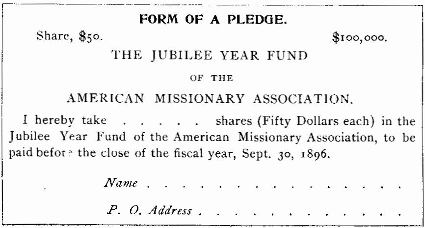 It is proposed to raise during the next six months a special Jubilee Year Fund of $100,000 in shares of $50 each, with the hope and expectation that these shares will be taken by the friends of missions without lessening those regular contributions which must be depended upon to sustain the current work.