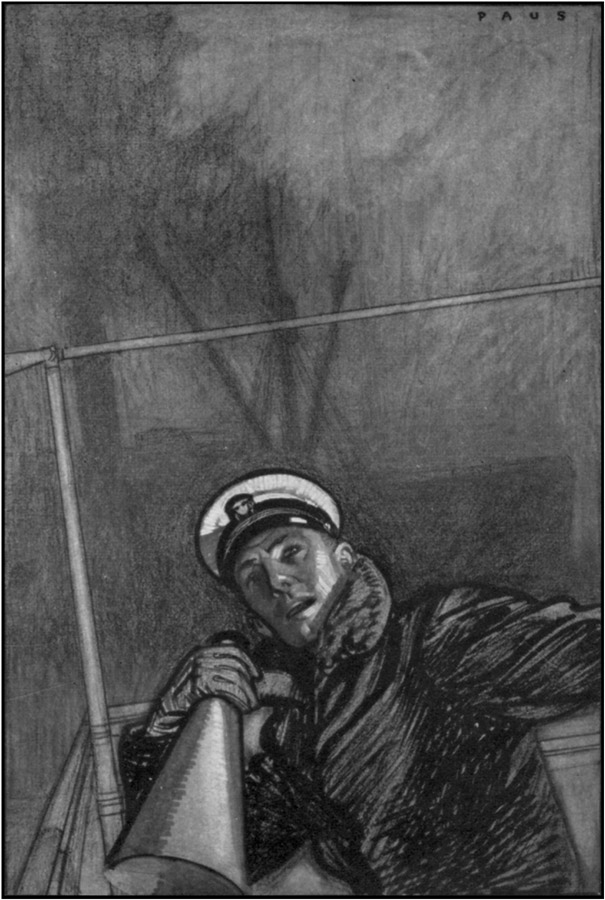 We were almost abreast of the first in line, and she was like a ship from fairyland. Along her run the bulbed lights extended, and thence to her turrets, and, higher up, followed the outline of stacks and tops and masts, with floating [8]strings of them suspended here and there between. Most striking of all, her name in gigantic, flaming letters faced forward from her bridge. Now one ship decked in a multiplicity of jewels on this clear calm night would have been a beautiful sight—but where there were forty-odd of them——!