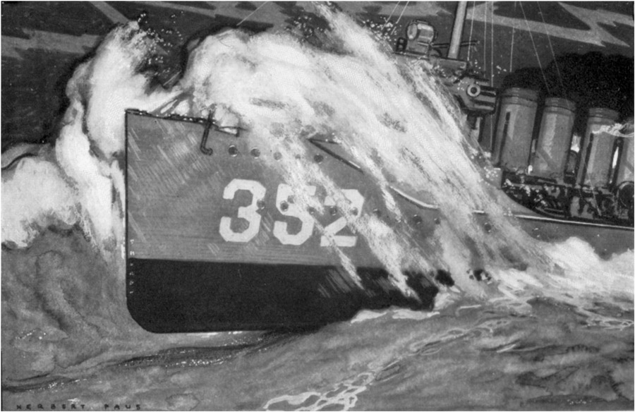She has a turn at porpoising then; that is from a moderate depth the diving-rudder man shoots her near enough to the surface for the captain to have a look through the periscope—a long-enough look to plot the enemy on a chart, but not long enough to give that enemy much of a chance to pick him up; and then under again. And then up for another peek; and quickly under again, the captain at the periscope taking each time a fresh bearing of the enemy, who is supposed to be at some distance and steaming at good speed. After two or three such quick sights, changing course after each sight, it will be time to discharge a torpedo or two at her. And—the layman may note it—with expert men at the periscope and diving-rudder, a porpoising sub can sight, discharge her torpedo, and dive—all within five seconds.