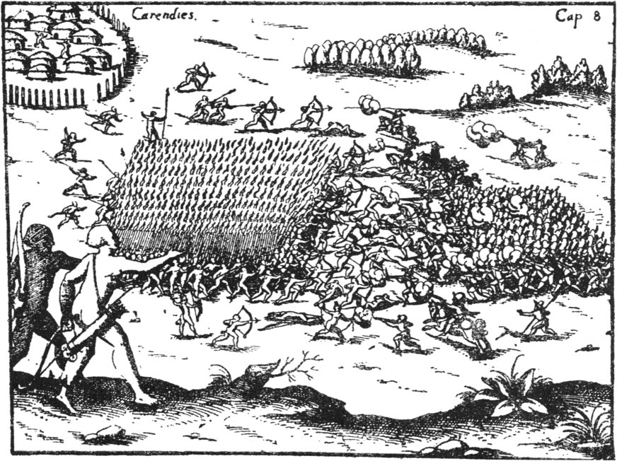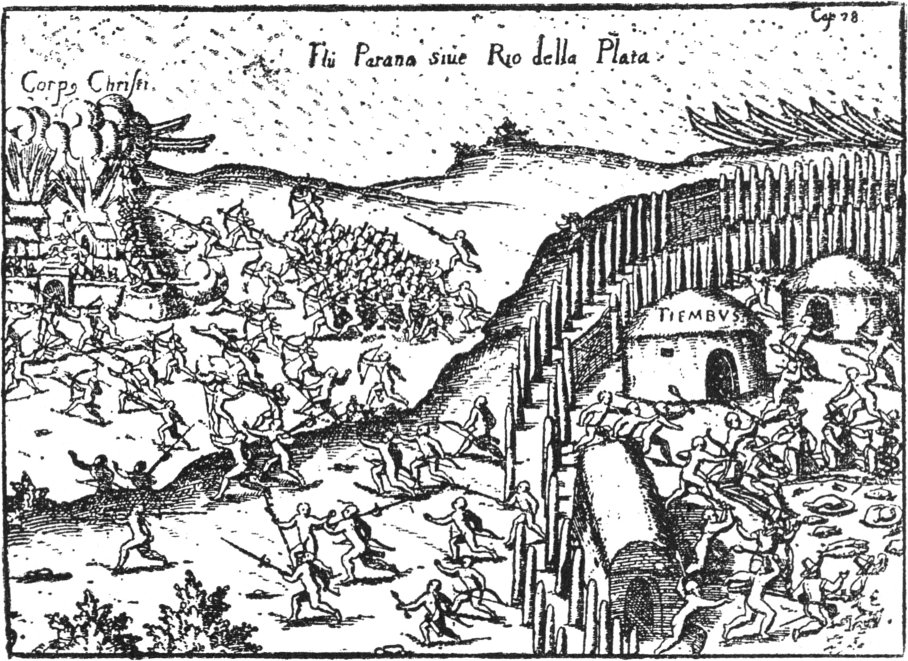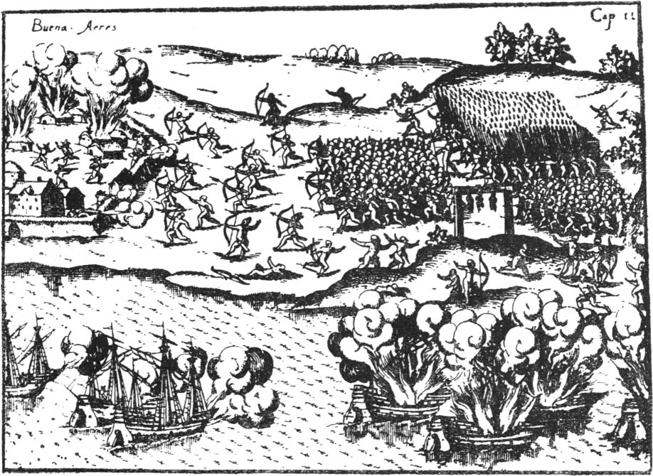 Da, es war am 27. Dezember 1536, erschienen plötzlich 23 000 Indianer von den Stämmen der Kerandís, Guaranís, Charrúas und Chaná Timbús vor der Stadt, schossen mit brennenden Pfeilen die strohgedeckten Lehmhütten in Brand und liefen Sturm gegen die Stadt. Es gelang ihnen sogar, vier Schiffe, die eine Meile vom Ufer vor Anker lagen, in Brand zu schießen, so daß sie von der bestürzten Besatzung verlassen werden mußten. Erst als die Schiffskanonen gegen sie abgefeuert wurden, zogen sie ab, nachdem sie dreißig Europäer erschlagen.