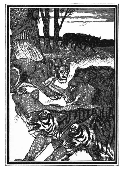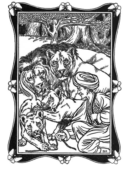 The Moor, thus become one of the family, took this occasion of making a good meal, skinned the sheep, made a fire, and then roasted a part, giving the entrails to the young. The lion in his turn came also; and, as if respecting the rights of hospitality, he showed no tokens whatever of ferocity. Their guest the next day, having finished his provisions, returned, and resolved never more to kill any of those animals, the noble generosity of which he had so fully proven. He stroked and caressed the cubs at taking leave of them, and the mother and father went with him till he was safely out of the forest.[Pg 97]