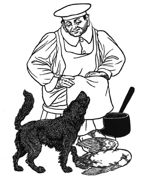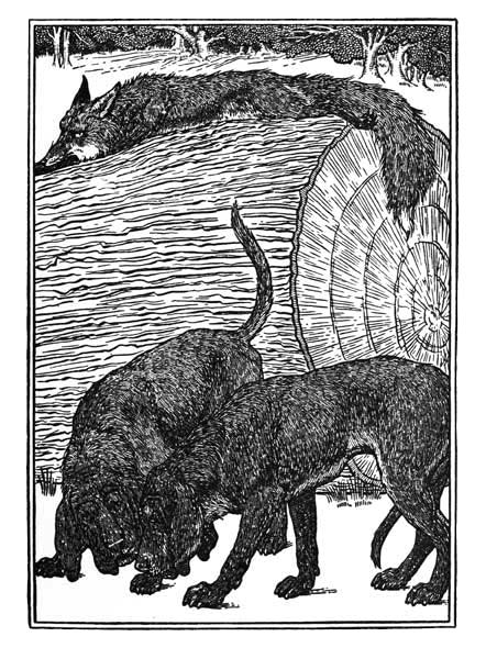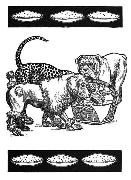 A french dog was taught by his master to run many different errands, among others to bring him his meals from a restaurant. The dog carried the food in a basket, and one evening, when the dog was returning to his master with his dinner, two other dogs, attracted by the savory smell coming from the basket, made up their minds to attack him. The dog put his basket on the ground and set himself courageously against the first one that advanced against him; but while he was fighting with one, the other ran to the basket, and began to help himself. At length, seeing that there was no chance of beating both dogs, and saving his master's dinner, he threw himself between his two opponents, and without further ceremony, quickly ate up the rest of the food himself, and then returned to his master with the empty basket.[Pg 151]
