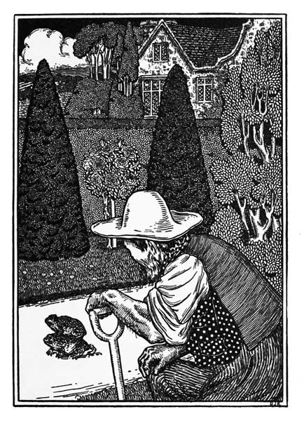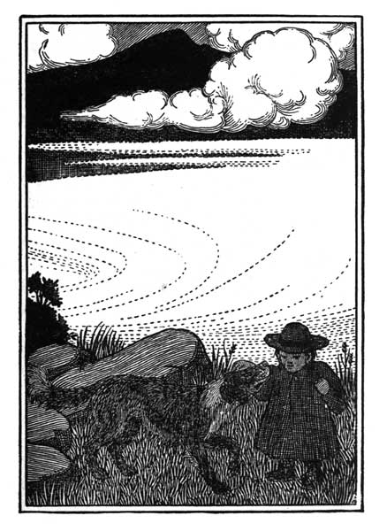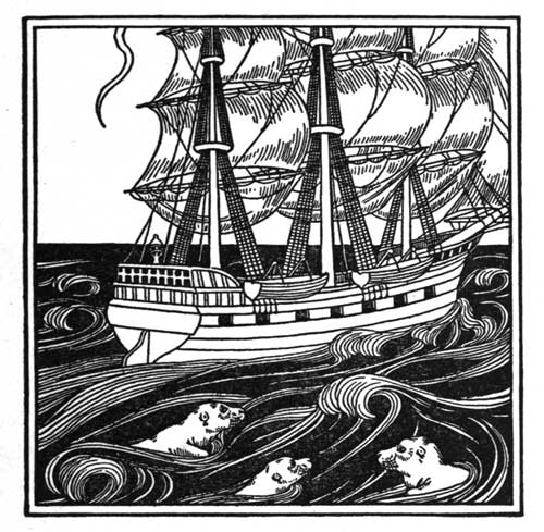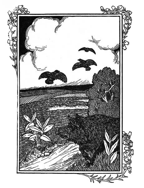 The little animal would often go out with the puppies to some distance from home; and he coaxed it farther by a sort of pudding made of barley meal, which he carried in one of his pockets. The other pocket he filled with stones, which he threw at the pig whenever she misbehaved.
