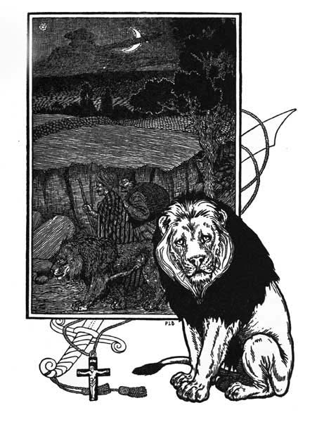 In a large menagerie there was a lion called Danco, whose cage needed some repairs. His keeper hired a carpenter to do the work, but when the workman came and saw the lion, he started back in terror. The keeper entered the animal's cage, and led him to the upper part of it, while the lower was being fixed. He there amused himself for some time playing with the lion, and being wearied, at last fell asleep. The carpenter, relying fully upon the vigilance of the keeper, went on rapidly with his work, and when he had finished it, he called him to see what was done. The keeper made no answer. Having repeatedly called him in vain, he began to feel alarmed at his situation, and he determined to go to the upper part of the cage, where, looking through the railing, he saw the lion and the keeper sleeping side by side. He immediately uttered a loud cry; the lion, awakened by the noise, started up and stared at the carpenter with an eye of fury, and then, placing his paw on the breast of his keeper, lay down to sleep again. At length the keeper was awakened by some of the attendants, and he did not appear in the least worried by the situation in which he found himself, but shook the lion by the paw, and then gently conducted him to his old cage.[Pg 127]