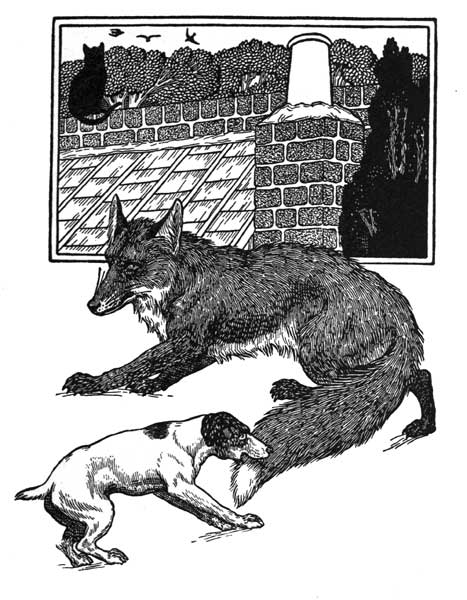 During a fox hunt, Reynard, being hard pressed, had to take refuge up the chimney of a hot house. He was followed by one of the hounds, who, passing through a flue nearly fifty feet in length, came out at the top of the chimney, but in some way missed Reynard in its dark recesses. By this time a number of people were collected at the top of the chimney. They let down a terrier, who, holding fast by his brush, soon drove him out.[Pg 95]