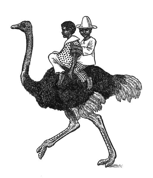 A gentleman tells how, during the time he was living at Podor, a French factory on the banks of the river Niger, there were two ostriches, though young, of gigantic size, which afforded him a very remarkable sight. “They were,” he says, “so tame that two little blacks mounted both together on the back of the largest. No sooner did he feel their weight, than he began to run as fast as possible, and carried them several times round the village, as it was impossible to stop him otherwise than by putting something in the path. This sight pleased me so much, that I was anxious to have it repeated, and to try their strength, directed a full-grown negro to mount the smaller and the two boys the larger. This burden did not seem at all too much for their strength. At first they went at a fairly sharp trot, but when they became heated a little, they expanded their wings as though to catch the wind, and moved with such fleetness that they scarcely seemed to touch the ground. Most people have, at one time or another, seen a partridge run; and therefore know that there is no man whatever able to keep up with it; and it is easy to imagine, that if this bird had a longer step, its speed would be much greater. The ostrich moves much like the partridge, with this advantage; and I am satisfied that[Pg 101] those I am speaking of, would have distanced the fleetest racehorses that were ever bred in England. It is true they would not hold out as long as a horse; but they would undoubtedly go over a given space in less time. I have often seen this performance, and it gives one an idea of the wonderful strength of an ostrich, and shows of what use it might be, did we but know how to break and manage it as we do a horse.”[Pg 102]