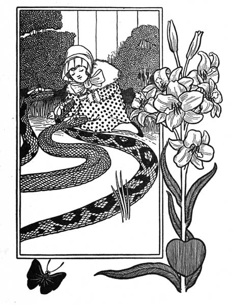 A little girl about three years of age was noticed for a number of days going a considerable distance from the house with a piece of bread her mother had given her. This attracted the attention of the mother, who asked the father to follow the child, and find out what she did with the bread. On coming to the child, he found her busy at work feeding several snakes of the species of rattlesnakes called yellow heads. He quickly took her away, went to the house for his gun, and returning, killed two of them at one shot, and another a few days afterward. The child called these snakes as you would call chickens, and when her father told her if she let them come so near her, they would bite her, she replied, “No, they won't bite. They only eat the bread I give them.”[Pg 107]