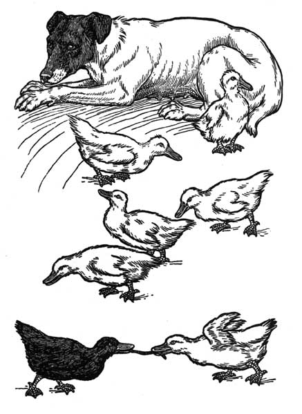 On an estate in Scotland a terrier had a litter of pups, which were at once taken away from her and drowned. The unfortunate mother was very unhappy, until, a few weeks later, she saw a brood of ducklings, which she seized and carried to her house, where she kept them, following them in and out with the greatest care, and nursing them after her own fashion, with the most affectionate anxiety. When the ducklings, following their natural instinct, went into the water, their foster-mother was terribly alarmed; and as soon as they came back to land, she quickly snatched them up in her mouth, and ran home with them. What is still more strange is, that the same animal, when her litter of pups were taken away the year before, seized two chicks, which she brought up with the same care she now bestowed upon the ducks. When the young cocks began to try their voices, their foster-mother was as much annoyed as she now was by the swimming of the duckings—and never failed to repress their attempts at crowing.[Pg 115]