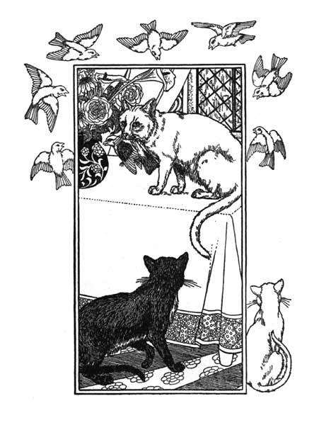 A lady had a tame bird which she was in the habit of letting out of its cage every day. One morning as it was picking crumbs of bread off the carpet, her cat, who had always showed before great kindness toward the bird, suddenly seized it, and jumped with it in her mouth upon a table. The lady was alarmed for the fate of her favorite, but on turning about, instantly saw the cause. The door had been left open, and a strange cat had just come into the room! After she had put it out, her own cat came down from her place of safety, and dropped the bird without having done it the least injury.[Pg 125]