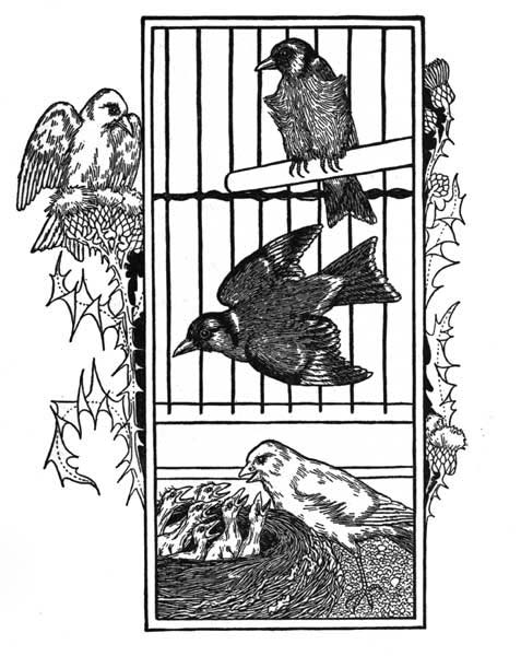 A pair of goldfinches who had had the misfortune to be captured with their nest and six young ones, were placed in a double cage, with a pair of canaries, which had a brood of little ones also; there being a partition of wire netting between the cages.