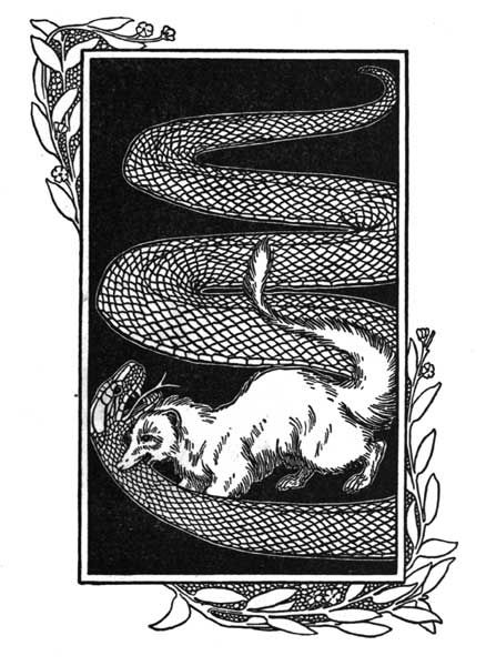 The Indian ichneumon, a small creature, looking like both the weasel and the mongoose, is of great use to the natives because of its great hatred of snakes, which would otherwise make every footstep of the traveller most dangerous. This little creature, on seeing a snake, no matter how large, will instantly dart on it, and seize it by the throat, if he finds himself in an open place, where he has a chance of running to a certain herb, which he some way knows to be an antidote against the poison of the bite, if he should happen to receive one. A gentleman visiting the island of Ceylon saw the experiment tried in a closed room, where the ichneumon, instead of attacking his enemy, did all in his power to avoid him. On being carried out of the house, however, and put near his antagonist in the field, he at once darted at the snake, and soon killed it. It then suddenly disappeared for a few minutes, and again returned as soon as it had found and eaten the herb it knew was an antidote.[Pg 157]