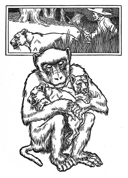 A party of a ship's crew was sent ashore on a part of the coast of India, for the purpose of cutting wood for the ship. One of the men, having strayed from the rest, was greatly frightened by the appearance of a large lioness, who came toward him. But when she had come up to him, she lay down at his feet, and looked very earnestly, first at him, and then at a tree a short distance off. After doing this several times, she arose and started toward the tree, looking back at the man several times, as if trying to make him follow her. At length he went, and when he reached the tree, he saw a huge baboon with two young cubs in her arms. He supposed they must belong to the lioness, as she lay down like a cat, and seemed to be watching them very anxiously. The man being afraid to climb the tree, decided to cut it down, and having his axe with him, he at once set to work, the lioness, meantime, watching to see what he was doing. When the tree fell, she sprang upon the baboon, and after tearing her in pieces, she turned round and fawned round the man, rubbing her head against him in great fondness, and in token of her gratitude for the service he had done her. After this she took the cubs away, one at a time, and the man went back to the ship.[Pg 167]