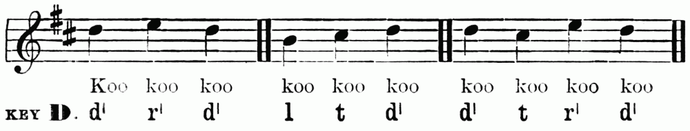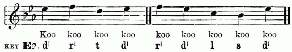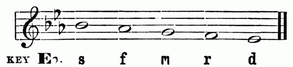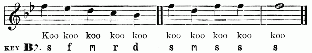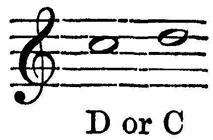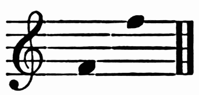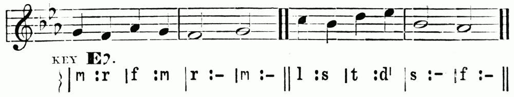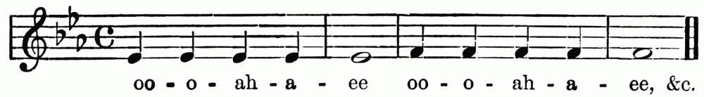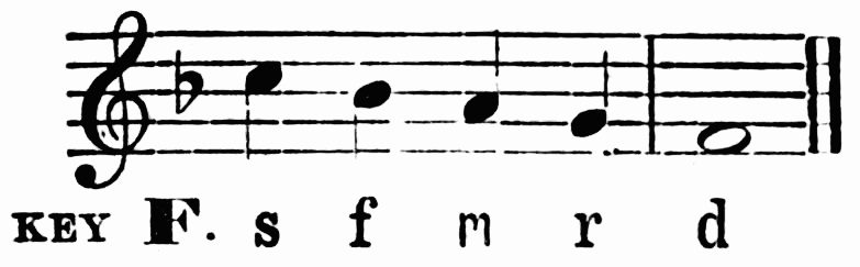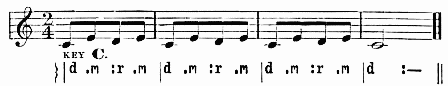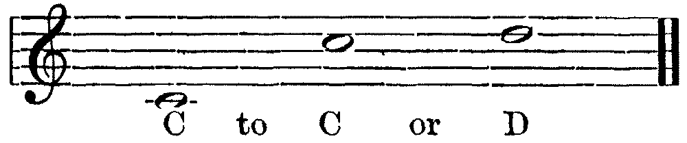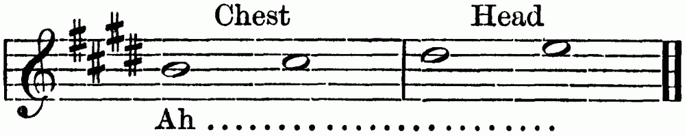 Breathing in singing is a matter of the utmost importance. The breath is the motive power, the primary force, to which the larynx and the resonance chamber are but secondary. In speech we can manage with short breathing and half-filled lungs, but in sustaining the sounds of song, we need to breathe deeply, and to breathe in a right way. Manifestly the act of breathing consists of two parts—(1) the drawing in, and (2) the letting out of the breath. When we speak of modes of breathing, however, we refer to the drawing in of the breath. There are three ways of doing this. First, by lowering the diaphragm, and thus compelling the lungs to enlarge and fill the vacant space created. Second, by extending the ribs sideways, causing the lungs to expand laterally. Third, by drawing up the collar-bone and shoulder blades, causing the upper part of the lungs to expand. The third method is bad; the ideal breathing is a combination of the first and second. Upon this athletes as well as singers are agreed. This is the breathing which we practise unconsciously in sleep, or in taking a long sniff at a flower. The musical results of bad breathing are flattening and a hurrying of the time; hence the importance of the matter. Practice may well begin with a few minutes devoted to breathing exercises. Let the boys inhale a long breath through the nose; hold it for a time, and then slowly exhale. Again let them slowly inhale, hold, and exhale quickly, allowing the sides of the chest to collapse. Again, let them, while holding the breath, press it{7} from the lower to the middle, and to the upper part of the chest, and vice versa. During this exercise the body should be in the position of "stand at ease." The spirometer, a useful but rather expensive little instrument, measures accurately lung capacity. These breathing exercises may be followed by practice in holding a single tone for a period just short of exhaustion.