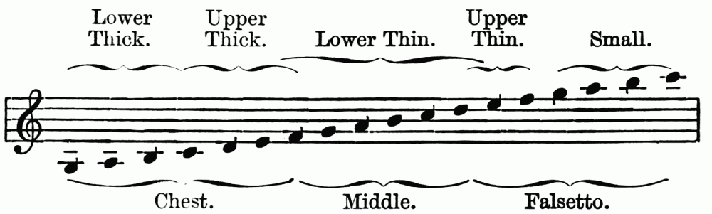 The second caution relates to the preservation, not of the boy's voice, but of the man's. There is no doubt that it is undesirable for a boy to continue to sing after his voice has shown signs of "breaking." What are the first signs of this change? Choirmasters notice that the middle register becomes weak, without any diminution in the power and quality of the upper notes, but that at the same time the thick register grows stronger, and the boy can strike middle C with firmness. "The striking of middle C," says Mr. G. Bernard Gilbert, "is usually sufficient to decide the point." The tradition of teachers is in favour of rest at this time, and a well-founded public impression counts for a good deal. The fact is that during the time of change not only do the vocal cords lengthen, but they are congested. An inflammatory action, like that which takes place during a cold, is set up. Hence rest is desirable. Nature herself also counsels rest because she reduces the musical value of the voice at this time to a low ebb. It becomes husky and of uncertain intonation. No doubt cases can be quoted of boys who have sung on uninterruptedly and developed into good tenors or basses, but there are cases equally strong in which the man's voice has completely failed after such a course. Sir Morell Mackenzie is the only medical writer who has advocated singing during change of voice, but not even his authority can upset the weight of evidence on the other side.