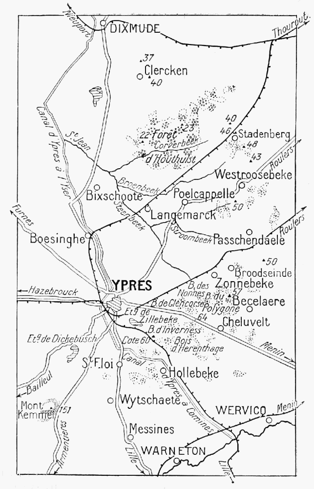 The principal military operations which took place in the vicinity of the town between October, 1914, and November, 1917, may be divided as follows:—First, a powerful German offensive—a counter-stroke to the battles of the Yser—then a very definite effort to take the town. The rôle of the Allied armies was at that time purely defensive.
