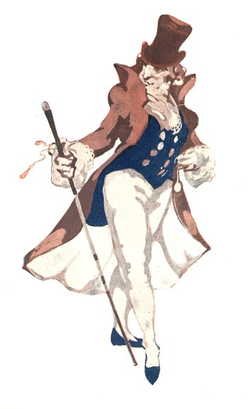 At Garble's, that nightly resort of titled rips and roysterers, he usually spent the early hours of his evenings. Round the illuminated garden, with La Gambogi, the dancer, on his arm, and a Bacchic retinue at his heels, he would amble leisurely, clad in Georgian costume, which was not then, of course, fancy dress, as it is now.[3] Now and again, in the midst of his noisy talk, he would crack a joke of the period, or break into a sentimental ballad, dance a little, or pick a quarrel. When he tired of such fooling, he would proceed to his box in the tiny al fresco theatre and patronize the jugglers, pugilists, play-actors and whatever eccentric persons happened to be performing there.