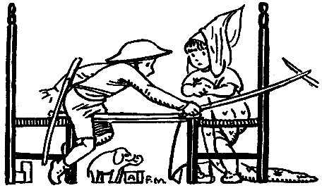 It was Hoppy who marred this sport. Hoppy was the keeper of the reservoir, a one-legged Irishman with a crutch. His superfluous trouser-leg was folded and pinned across, and it was a general quarry for patches. When his elbow or his knees came through, here was a remedy at hand. Here his wife clipped, also, for her crazy quilt. And all the little Hoppies—for I fancy him to have been a family man—were reinforced from this extra cloth. But when Hoppy's bad profile appeared at the top of the hill we grabbed our staves and scurried off. The cry of warning—"Peg-leg's a-comin'"—still haunts my memory. It was Hoppy's reward to lead one of us smaller fry roughly by the ear. Or he gripped us by the wrist and snapped his stinging finger at our nose. Then he pitched us through the fence where a wooden slat was gone.