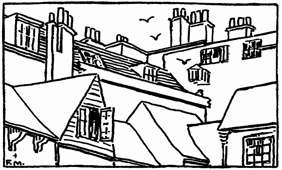 The peddlers of our village, our street musicians, our apple men, belong to us. They may wander now and then to the outside world for a silver tribute, yet they smile at us on their return as at their truest friends. Ice creaks up the street in a little cart and trickles at the cracks. Rags and bottles go by with a familiar, jangling bell. Scissors grinders have a bell, also, with a flat, tinny sound, like a cow that forever jerks its head with flies. But it was only the other day that two fellows went by selling brooms. These were interlopers from a noisier district, and they raised up such a clamor that one would have thought that the Armistice had been signed again. The clatter was so unusual—our own merchants are of quieter voice—that a dozen of us thrust our heads from our windows. Perhaps another German government had fallen. The novelist below me put out his shaggy beard. The girl with the slim legs was craned out of the sill with excitement. My pretty neighbor below, who is immaculate when I meet her on the stairs, was in her mob-cap.