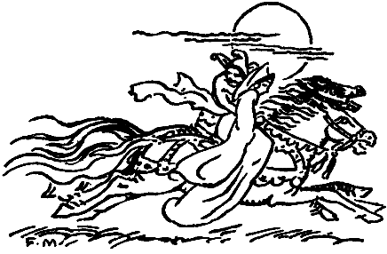 "They heard the clock strike ten and they saw the great tower rising above the castle with the silver moon upon it, but they galloped on and on. Through the forest they galloped, over bridges and streams. And the moon climbed off the tower and kept with them—as it does with all good folk—plunging through the clouds like a ship upon the ocean. And still they galloped on. Presently they met Jeppo returning from the tavern with the brass pull-handles. 'Yo, ho!' called out the King, and they passed him in a flash. Clackety-clack-clack, clackety-clack-clack, clack-clack, clackety-clack!