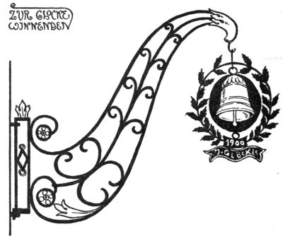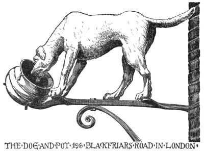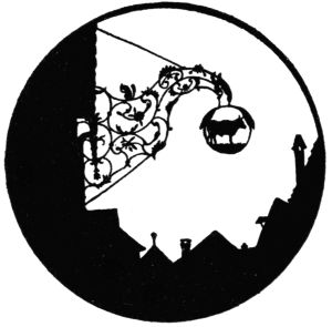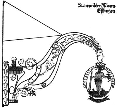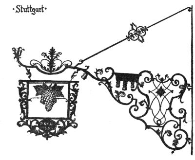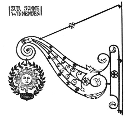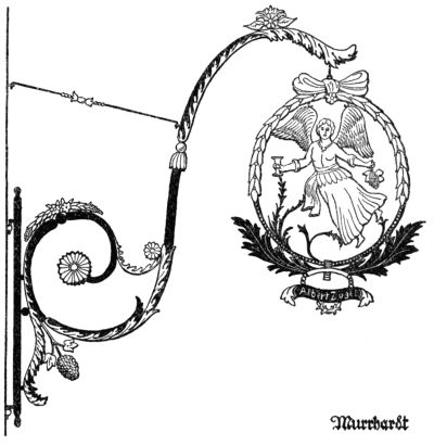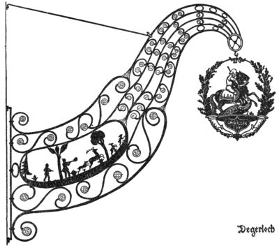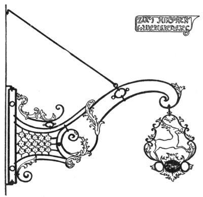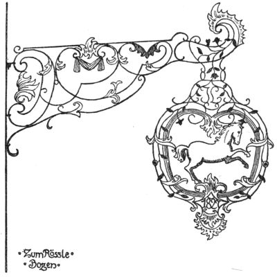 But the most ruthless enemy of the sign became the police itself, who once protected it. As early as the year 1419 we find an English police regulation, threatening with a fine of forty pence—in those days quite a sum—“that no one in future should have a stake bearing either his sign or leaves, extending or lying over the King’s highway, of greater length than seven feet at most.” As every innkeeper tried to outdo the other by the size and the magnificence of his sign,[Pg 270] one arrived finally at absurdly great constructions which really hampered the traffic: as in England, where we find wrought-iron signs which, like arches of triumph, reached from one side of the street to the other. A precious old book, “A Vademecum for Malt-Worms” (British Museum), in a quaint woodcut, “The Dog in Shoreditch,” gives us a picture of such a sign monument. To the artist’s eyes they were charming things, combining happily great lanterns with the sign into a harmony which we so often find lacking in modern days, where beautiful old signs through the addition of ugly modern lamps lose all their artistic charm of yore.