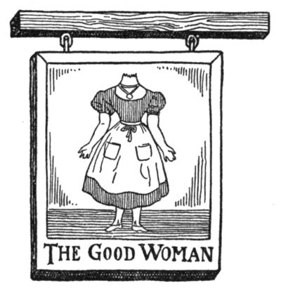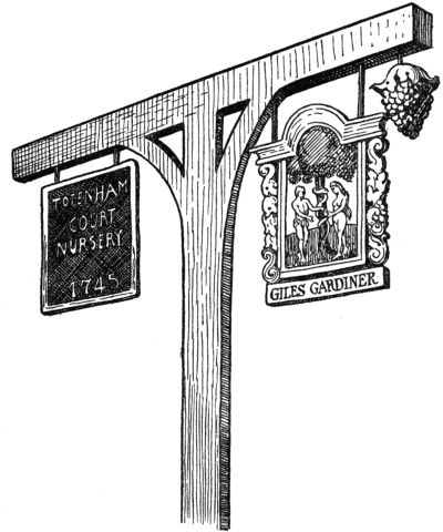 The present-day tourist who takes the bus[Pg 7] out Finchley Road to hunt up the old sign will be as sorely disappointed as if he expected to find the “Angel” shield in Islington or the quaint “Elephant and Castle” sign in South London. Almost all the old London signs have vanished out of the streets, and only a few of them have taken refuge in the dark sub-basement of the Guildhall Museum, where they lead a right pitiable existence, dreaming of the better days when they hung glistening in the happy sunshine. There were “Adam and Eve” taverns in London, in “Little Britain,” and in Kensington High Street. In other countries, France and Switzerland, for example, they were called “Paradise” signs. A last feeble echo of the old Paradise sign lingers in the inscription over a fashion shop in modern Paris, “Au Paradis des Dames,” the woman’s paradise, in which are sold, it must be said, only articles for which Eve in Paradise had no use.
