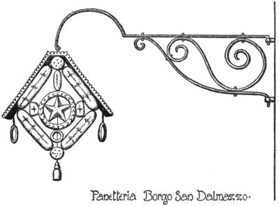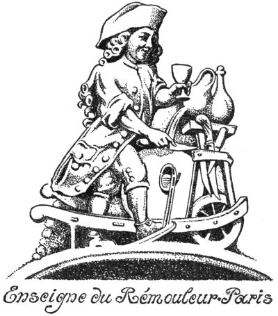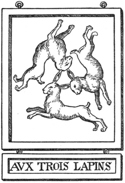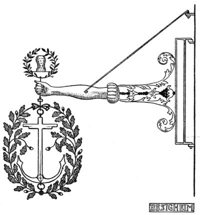 If the police had contented itself in eliminating the offensive or really dangerous signs, nobody[Pg 273] could have blamed it. Unfortunately it was much more aggressive, especially in France, the paradise of the “ronds de cuir,” and attempted to cut down every individual or artistic invention on the part of the signmakers. We are, therefore, not surprised to find so little in modern France that could remind us of the old abundance. The officials of the Revolution proved themselves just as narrow-minded as those of royal times. Both, animated by the bureaucratic instinct to confine everything to narrow rules, tried to suppress all individual poetical invention that once was the charm of the sign. A royal edict of 1763 prescribes a very uninteresting design as a binding model for all signs, giving at the same time the exact measurements of the same and warning the public not to dare to make any changes on the “dessein cy-dessus marqué.” It was a poor consolation for the owners of beautiful old signs that the same edict granted them the great privilege of giving their art-treasures in account as old iron—“quinze deniers la livre”—when paying the bill for the new sign patented by the State. Still more radically acted the men of the Revolution, who sincerely hated the[Pg 274] signs, with their crowns and heraldry, as abominable “marques du despotisme.” They made short work, and simply ordered: “Toutes les enseignes qui portent des signes de royalisme, féodalité et de superstition seront renouvelées et remplacées par des signes républicains: les enseignes ne seront plus saillantes mais simplement peintes sur les murs des maisons.”