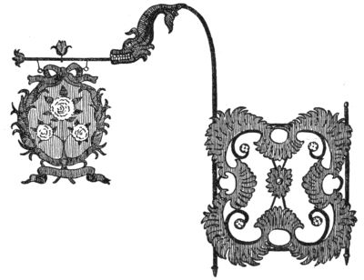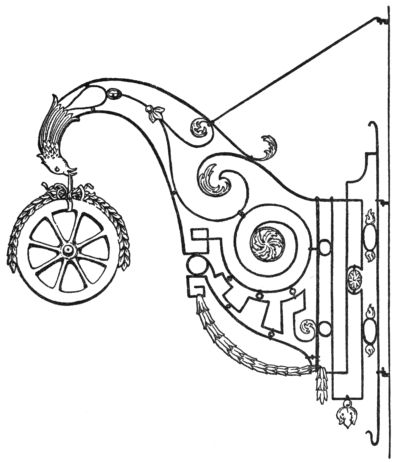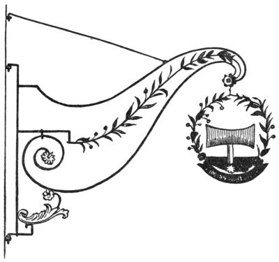 Signs wrought in iron seem to have been rare in England, the art of forging being less developed there than in the south of Germany.[Pg 241] Curiously enough the South-Kensington Museum in London, an enormous storehouse of old works of arts and crafts, contains not a single English sign, but a very beautifully forged iron sign from Germany, dated 1635,—a baker’s sign, as the great crown and the heraldic lions reveal to us. A friendly assistant at the Museum showed us another German sign dating from the end of the seventeenth century, charmingly carved and gilded, representing the workshop of a shoemaker. These two were the only signs that the Museum possessed.
