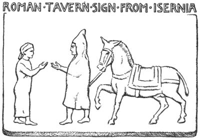 We must now take leave of “holy hospitality” which is written in the hearts of men and truly needs no outward sign, and must follow Iago’s counsel: “Put money in thy purse!” For our journey is no longer from friend to friend, but from host to host and from sign to sign. Regret it as we may, a hospitality for profit’s sake had to succeed the old free hospitality of friends. The widening commerce of the Roman world-empire could hardly have existed without a well-regulated business of entertainment along those magnificent roads by which the empire was bound together. The traveler was more and more unlikely, with every extension of the area of his far journeyings, to find houses to which he was bound by the friendly ties of genuine hospitality; while he[Pg 26] who remained quietly by his own fireside (“qui sedet post fornacem”) would find the constantly increasing duties of the voluntary host growing to be so great a burden that he would be relieved to see the establishment of public inns. Indeed, he may himself, at first, have sought relief by charging his guests a nominal sum to defray their expense. At any rate, it would be very difficult to fix an exact line between these two forms of entertainment, which existed side by side for long ages of antiquity. Certain it is that at some moment, we know not just when, there appeared the Pompeian inscription over the tavern door: “Hospitium hic locatur.” (Hospitality for hire.) That was the birth-hour of the tavern sign.