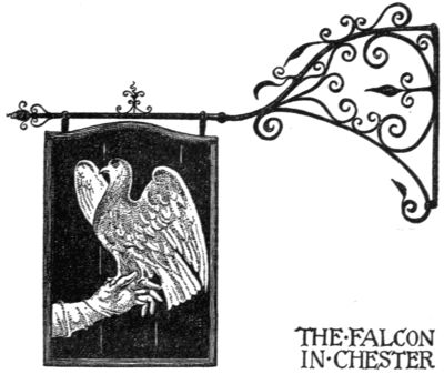 The old London signs have all found a very dismal refuge in the dimly lighted cellar of the Guild Hall. Some of them are stone sculptures of considerable size like the giant sign “Bull and Mouth.” Here too we find certain technical curiosities, as, “The Dolphin” of 1730 painted on copper, and more unusual still, “The Cock and Bottle,” a neat and dainty design composed of blue-and-white Dutch tiles. The foggy and damp climate has often injured not only the carved woodwork of the signboard, but still more the painting on it. The beam on which it hangs might be very old; the painting itself[Pg 242] is always of recent date even if the artist, following an old tradition, sometimes produces quaint effects. As an example of how quickly the work of the sign-painter darkens beyond recognition, we may cite “The Falstaff” in Canterbury. It was not a year since the landlady had hung out this picture of the blustering knight in a bold fencing-pose that we saw it last, and it was already very difficult to distinguish the details of the composition; while another painting—the immediate predecessor of the sign in the street—which the friendly Dame showed us on the staircase was as black and bare as a slate. Sometimes the frames of the pictures are carved and allow us to guess the date of their origin; but, as a rule, the perfectly plain signboard hangs out on a strong beam. A typical example is “The Falcon” in Stratford-on-Avon.