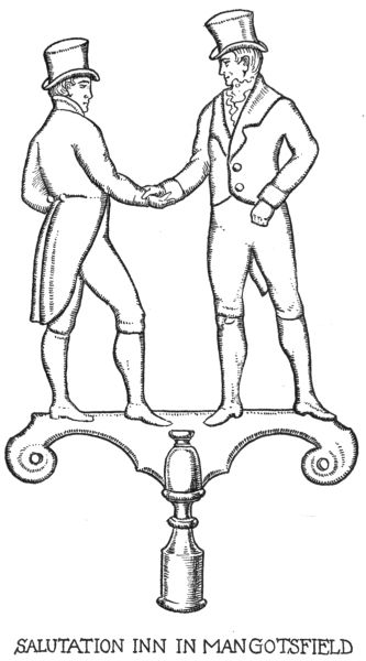 Our design of two gentlemen saluting each other politely is such a club sign, reproducing in miniature the sign of the “Salutation Inn” in Mangotsfield, and representing the last link in the chain of salutation signs, which began with the old religious scene of Mary saluted by the angel.