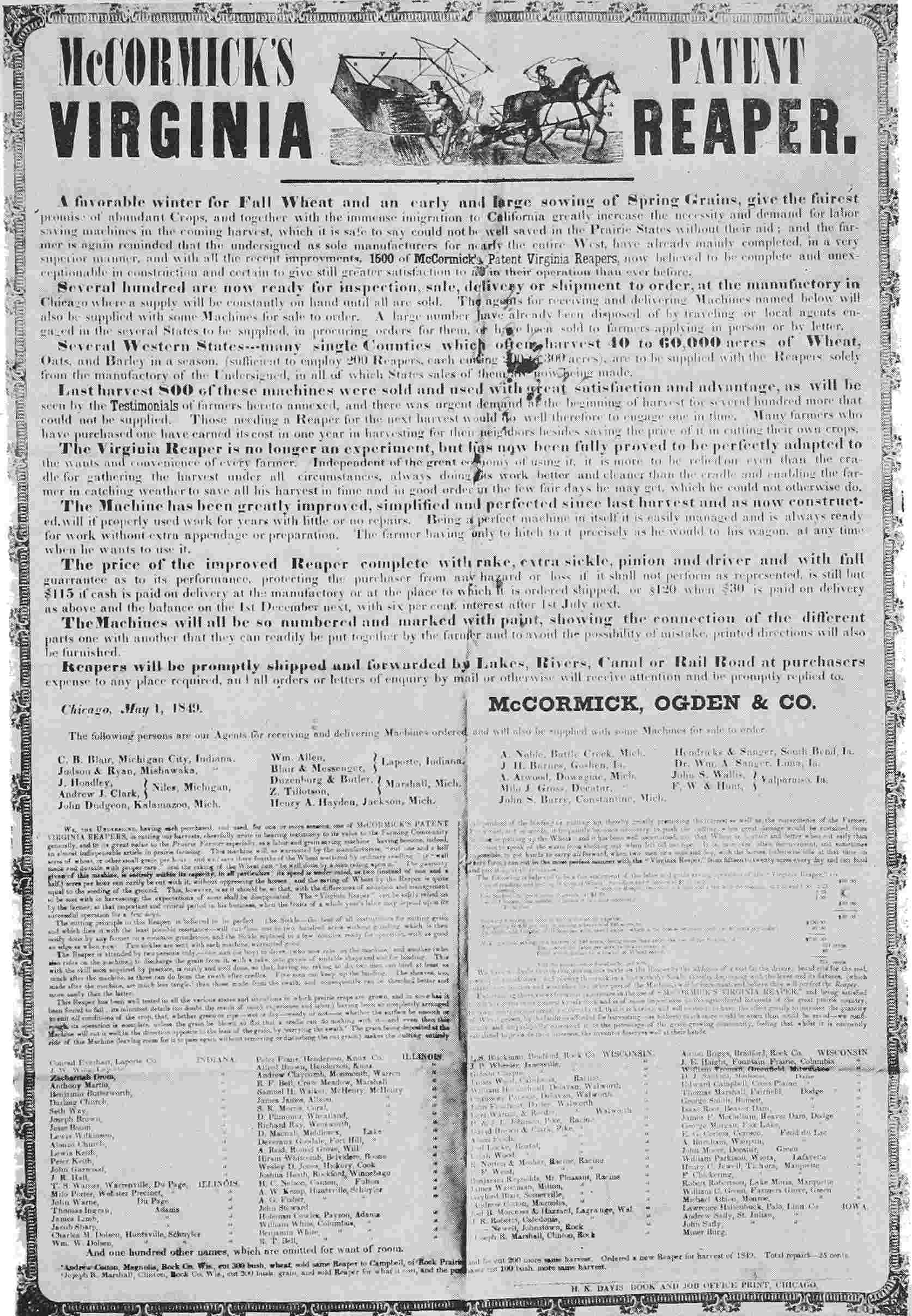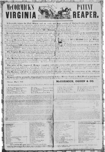Page 64: The lower portion of the illustration "AN EARLY ADVERTISEMENT FOR McCORMICK'S PATENT VIRGINIA REAPER" was not readable in the source from which this eBook is derived.