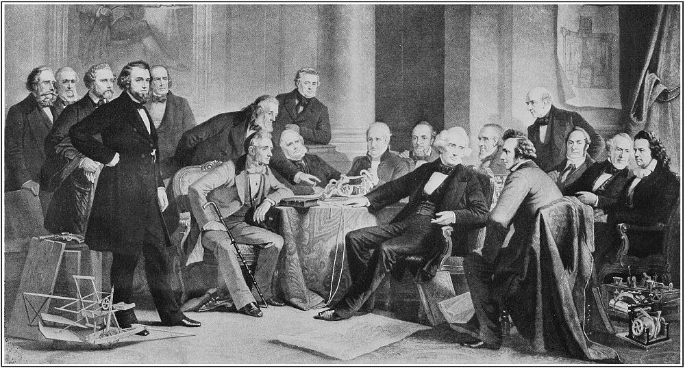 Up to the year 1809 the chief topics of interest in American legislatures and grocery stores were the blockades, the Embargo, the treaties, the badness of Napoleon, the blunders of Jefferson, and the rudeness of England and France. But after that year the chief topics of interest came to be of a wholly different sort. They were such as the tariff, the currency, the building of factories and canals, the opening of public[11] lands, the problem of slavery, and the development of the West. The hardy, victorious little nation began to talk less and work more; and so by a natural evolution of thought the era of George Washington and Thomas Jefferson came to an end, and the era of Robert Fulton and Peter Cooper and Cyrus Hall McCormick was in its dawn.