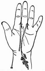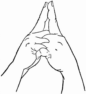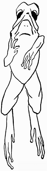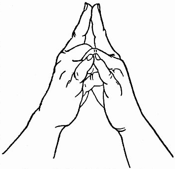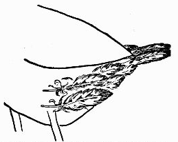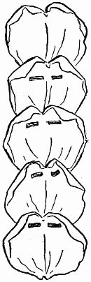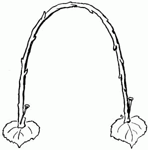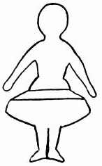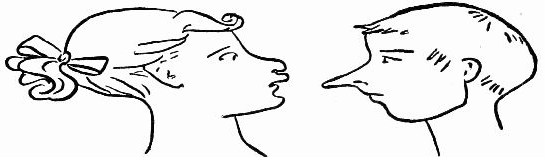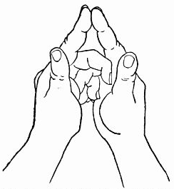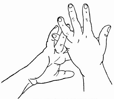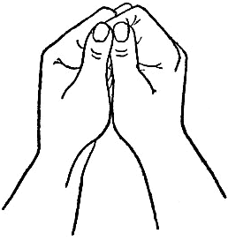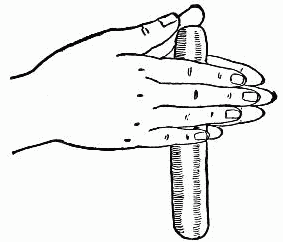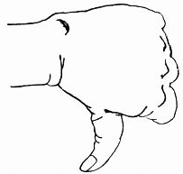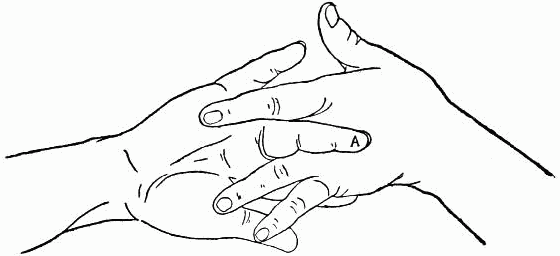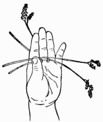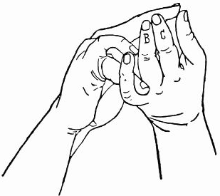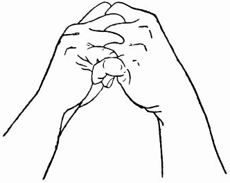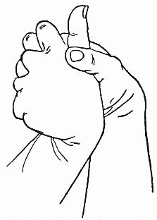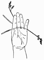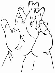The leader proceeds with "Simon says, 'Thumbs up,'" then up must go all thumbs, and when "Simon says 'Wiggle waggle,'" all move their thumbs from side to side while the hand rests in position (Fig. 564)—dotted lines show the swing of the thumb. If any neglect to do so it counts one against him; next comes the order "Stop"; the thumbs continuing to wag, the leader calls "Simon says 'Thumbs stop.'" The leader may command a change in the position and movement of the hand and thumb according to his fancy, but the hand cannot be unclasped nor the thumb folded down during the game. Three failures count the player out, and he must then content himself with watching the others until the play ends. The leader, being privileged, follows all directions in order to confuse the others. The game is short, consisting of ten commands from the leader. It may be played with sides, the group dividing into two parties; the young people at one end of the wagon form one side, while those at the other end constitute the other side. The party losing fewest players wins the game.