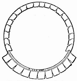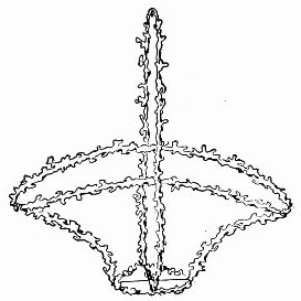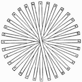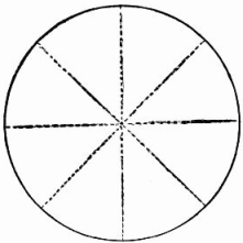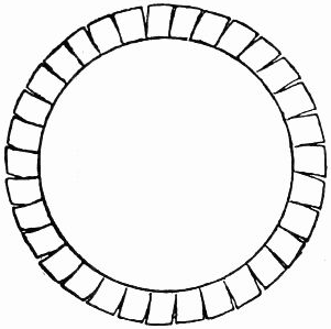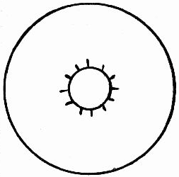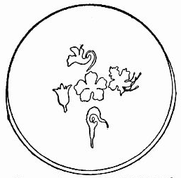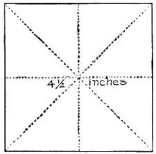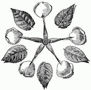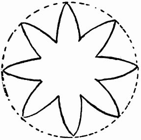 Under the tip of each point slide the inner end of a rose petal, any color you choose. Between each two rose petals gum a green leaf (Fig. 559). Now take away the star centre and use rose petals in its place, and you will have a "rose window" design. Try alternating red and dark-red velvet petals, or use all yellow petals. In this way you may form a variety of patterns painted with roses.