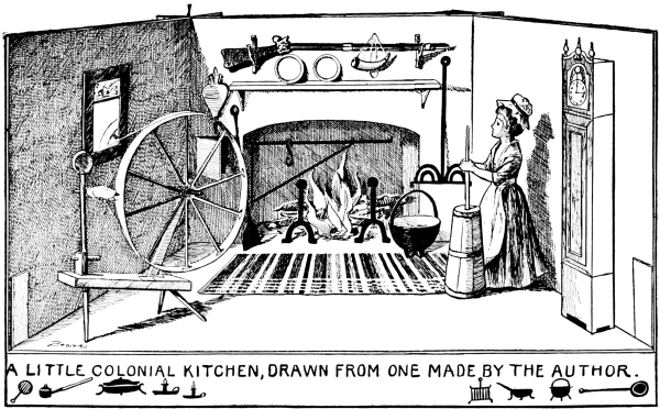 The Floor, 135; The Fireplace, 138; A Hair-pin Crane, 138; Little Dutch Oven, 139; Two Andirons, 141; The Fire, 142; Iron Pot, 143; The Peel, 144; The Toaster, 144; Pot-Hooks, 145; The Spinning-Wheel, 147; The Little Spinner, 150; The Costume, 150; Flint-Lock Rifle, 151; The Bellows, 153; Colonial Pewter Dish, 154; Grandfather's Clock, 155; Colonial Churn, 160. | |