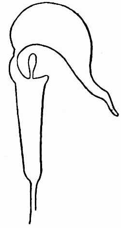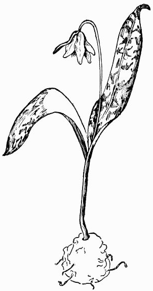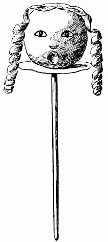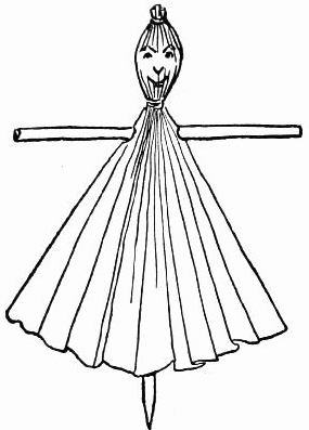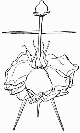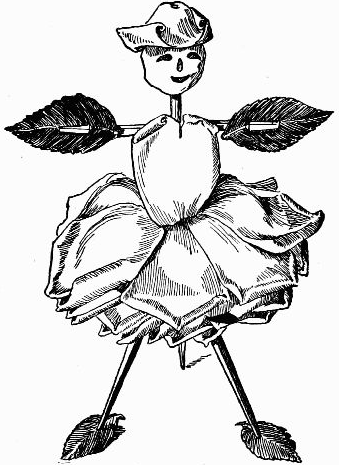 Fashion the head from an old seed-vessel, which you will probably find still clinging to one of the rose-bushes. First make a small hole quite deep in the top of the seed-vessel; then push the end of the stem of the rose up into the head (Fig. 543). Run each toothpick arm through a green leaf and use a white or pale-pink rose petal for the girl's face (Fig. 544). Pin the petal to the head with four rose thorns, using two for the eyes, one for the nose, and one for the mouth. Pin a rose petal on the top of the head for a hat. Turn backward two petals, without breaking them from the rose, to form the dress waist; pin or gum one petal to the arms and neck in front and the other to the arms and neck at the back. Then stick three wooden toothpicks in the top of the rose (Fig. 544); place the toothpicks so they will form a tripod,[325] two on a line across the front and the third a trifle back of and midway between the front ones. These three toothpicks will enable the rose girl to stand alone; the two foremost serve as legs and the other as a support. You can make feet of two green leaves stuck on the ends of the two front toothpicks (Fig. 544).