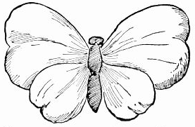 Rose butterflies do not look exactly like real ones, but they are very pretty, and you can readily paint one. Arrange two large red rose petals for the front wings (Fig. 557); slightly over-lapping the lower edges of these lay two smaller white petals, and make the body of a green leaf cut like Fig. 558. Gum it down over the lengthwise centre of the group of petals.