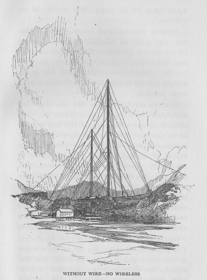 You could telephone the office? How and over what unless wire were used? Wireless? Without the coils and armatures that keep the instruments going or the aerials that seize the word wave in its flight, there would be no wireless.