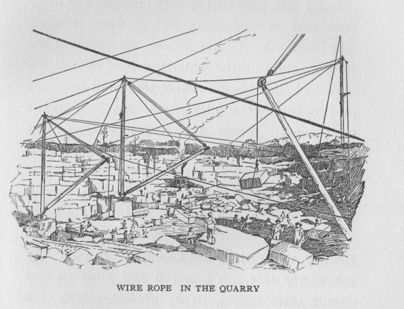 Wire rope had lingered, waiting for civilization’s loads to grow. The artisans of old had woven cut wires together to make the trinkets of their time, little dreaming of the might that lay hidden in the fibres of the iron, and their world went on hoisting stone for its pyramids by prodigious multiplication of garlic-fed man-power. It seems strange to the high-speed mind of today that five hundred years could have passed, after the drawing of wire was invented, before necessity put it into the mind of a wire-drawer that with wire, as with other things, strength lay in union. And yet the human race had been making rope since the morning stars sang together.