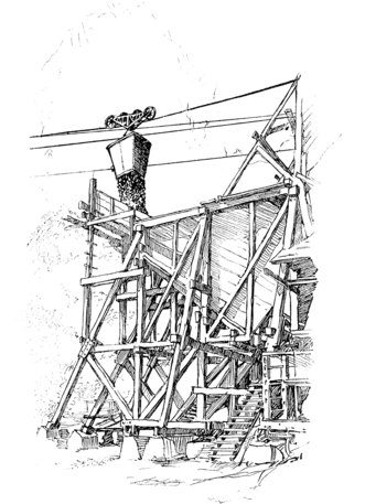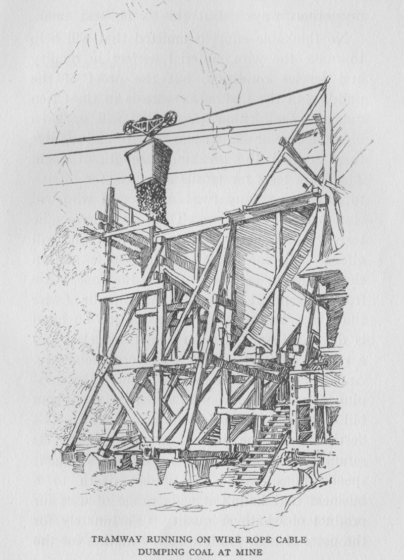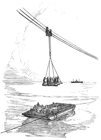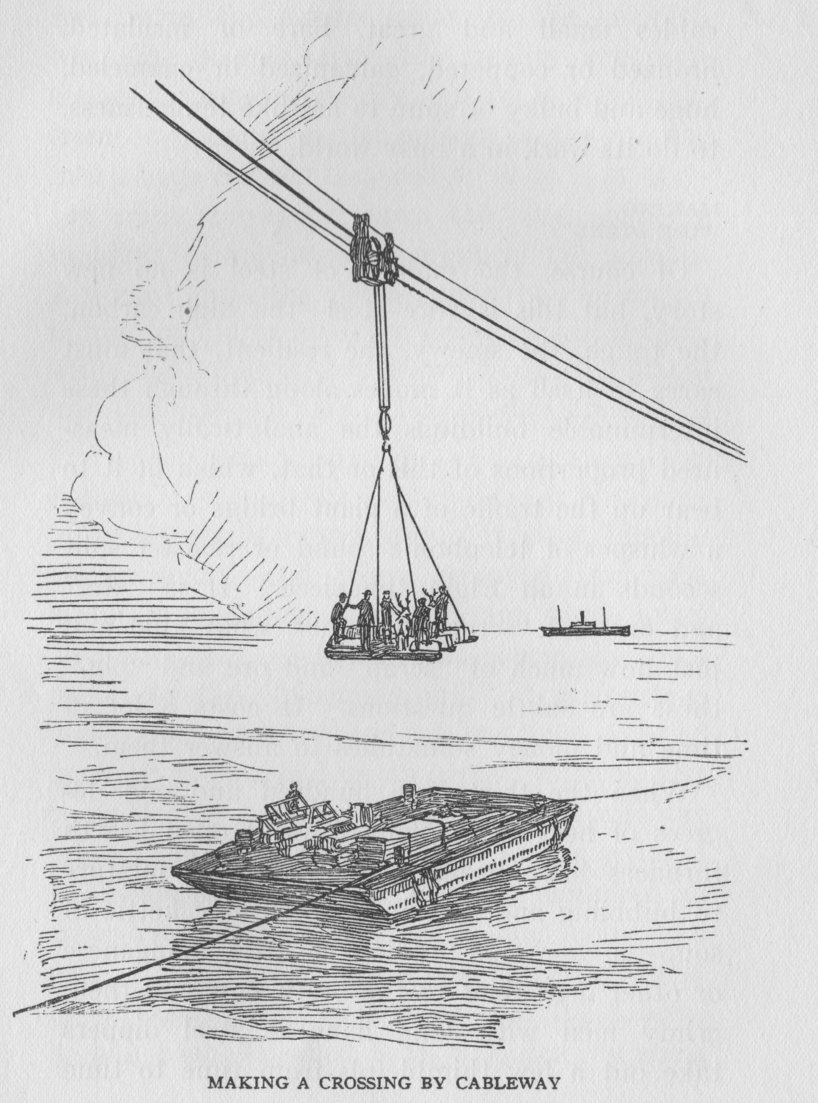 Persistently militant, from the day of his first achievement, in the promotion of wire rope, John A. Roebling was the first engineer to introduce into America the novelty of a wire cableway, which with an ingenious carriage he employed to transport across a river the materials he needed in the construction of a bridge. This method of haulage, over streams and gorges, down from high mountains to cars or boats in the valley below, up from the deep-sunken beds of rich placers—everywhere and in all sorts of places where Nature seemed to have set up impassable defense against those who would take away her treasures—came forthwith into widespread use, and is among the handy tools of engineers throughout the world today. The Roebling Company established these cableways in many countries. It had in operation around the globe no less than twenty different types, including log rigs and gravity planes for mountain railways, and the demand for wire rope was increased thereby a thousand fold before the new century had come in.