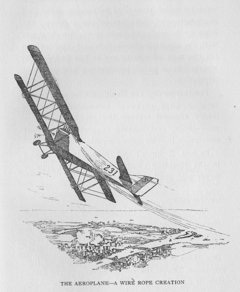Distinctly, it would not be your busy day. You might spend it looking out of the window at the ships going down the river, but unhappily, the majestic liner is compact of wire, from her glistening trucks to the deepest shadows of the engine room; or airplanes soaring and swaying above the teeming town and far-stretched waterways. But an airplane lives by wire. It could neither fly nor steer nor even hold together if its frame were not strung with wire and its wings and ailerons and fuselage bound and braced and its machinery vitalized by divers forms of wire and wire strand and woven wire cord.
