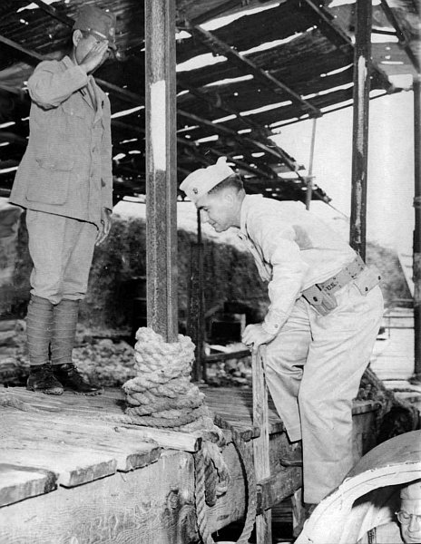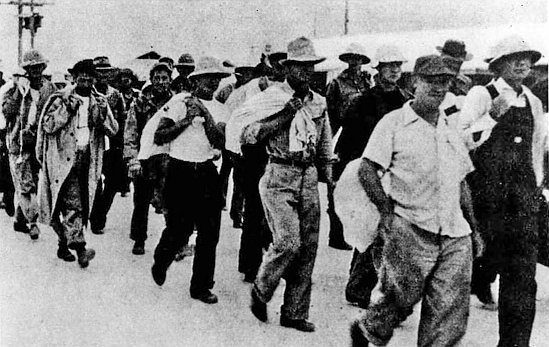 Civilian contractors are marched off to captivity after the Japanese captured Wake. Some, deemed important by the Japanese to finish construction projects, were retained there. Fearing a fifth column rising, the Japanese executed 98 contractors in October 1943, an atrocity for which atoll commander, RAdm Shigematsu Sakaibara, was hanged after the war.