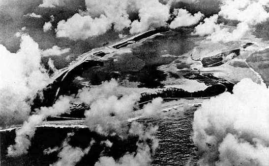 A May 1941 photo taken from the northeast, from a Navy Catalina flying boat, reveals the Wake Island coral atoll in the mid-Pacific beneath broken clouds. Wishbone-shaped Wake proper lies at left, as yet unmarked by construction of the airfield there. The upper portion of the photo shows Wilkes; at right is Peale, joined to Wake by a causeway.