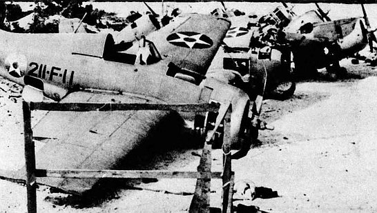 At 0400, Major Putnam put VMF-211 on the alert, and soon thereafter he and Captains Elrod, Tharin, and Freuler manned the four operational F4Fs. The Wildcats, a 100-pound bomb under each wing, then taxied into position for take-off. Shortly before 0500, Kajioka’s ships began their final run. At 0515, three Wildcats took off, followed after five minutes by the fourth. They rendezvoused at 12,000 feet above Toki Point. At 0522, the Japanese began shelling Wake.