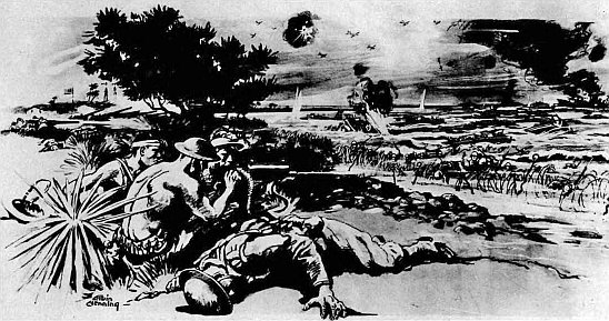 The flames from the wrecked Patrol Boat No. 33 disclosed Japanese troops advancing past the west end of the airstrip into the thick undergrowth in front of the mobile reserve’s positions. Poindexter, after ordering one machine gun section to keep up a fire into the brush to interdict that movement and protect his own flank, heard machine gun fire from Camp 1, behind him. Wanting to see for himself if more Japanese landing craft were coming ashore to his rear, the lieutenant, accompanied by his runner, left the front in charge of Sergeant “QT” Wade, and hurried back to the camp.