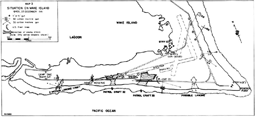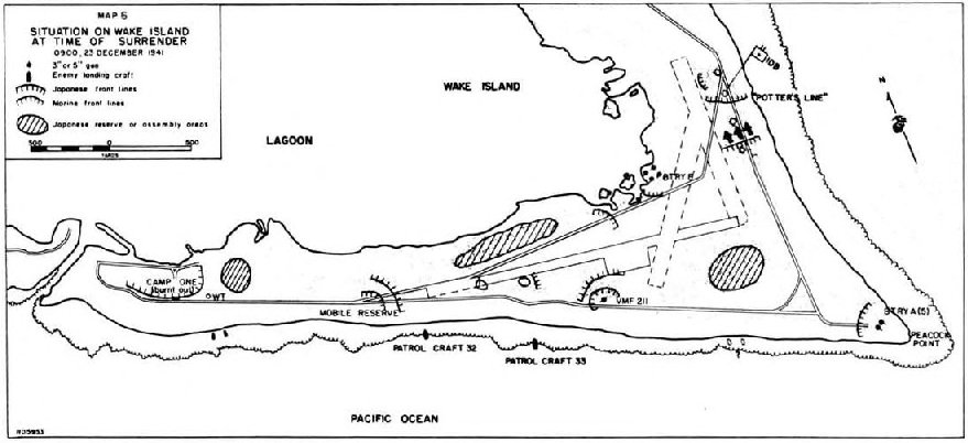 Having seen flares streaking skyward in the murk, Captain Godbold on Peale, meanwhile, sent out two patrols, one to move westward toward the naval air base, and the other to go eastward along the lagoon’s shore. Neither patrol encountered any enemy troops. A half-hour later, Godbold established an outpost at the bridge connecting Peale and Wake.