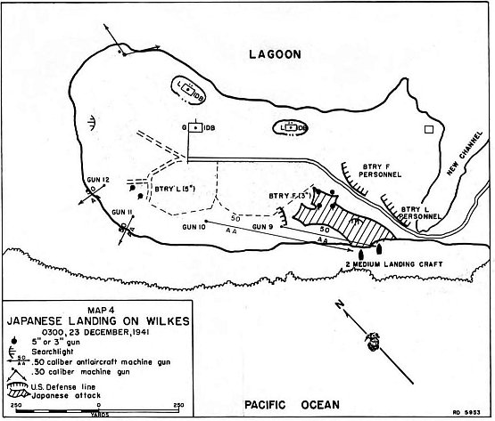 Devereux, still isolated from his units and literally in the dark about the actions on Wilkes and those in the vicinity of Camp 1, attempted as best he could to keep the island commander informed. Cunningham, consequently, also had scant comprehension of the way the fighting was progressing in those areas. At 0500, about the time Captain Platt was reconnoitering the Japanese position on Wilkes, Cunningham radioed Commandant 14th Naval District, “Enemy on island. Issue in doubt.”
