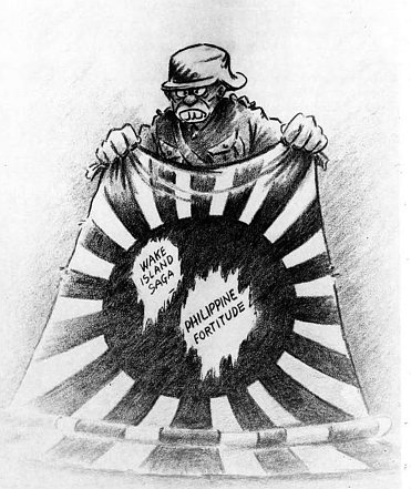 One of the many cartoons that mirrored Wake’s gallant battle, “Sun Spots,” shows holes marked “Wake Island Saga” and “Philippine Fortitude” in a Japanese flag.