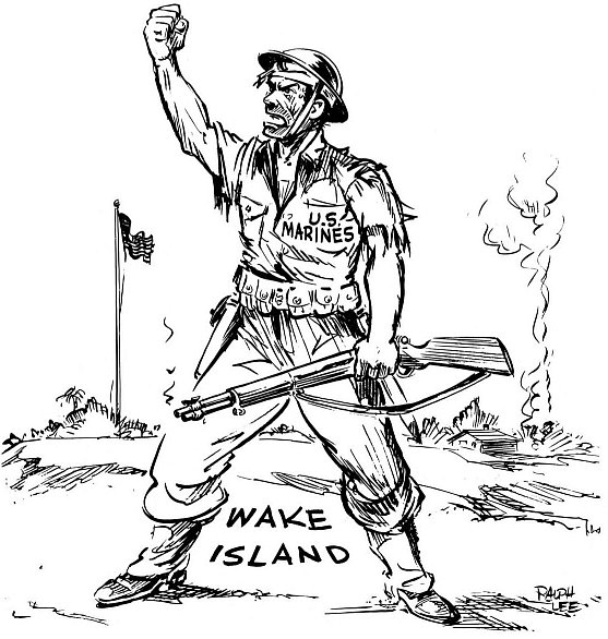 In a 1942 Ralph Lee cartoon a battered but still defiant Marine shakes his fist angrily at Japanese planes overhead.